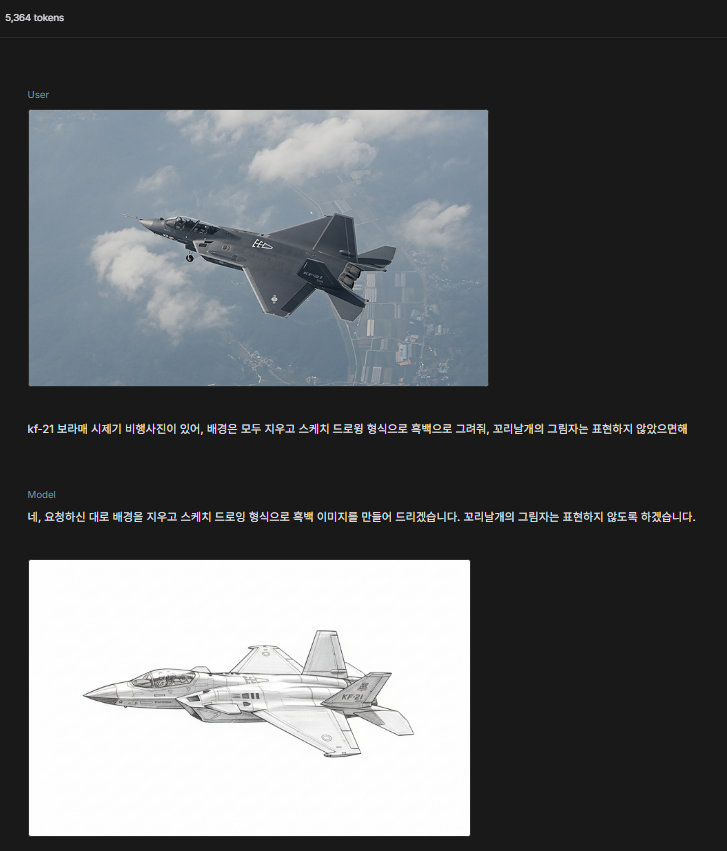 • Input tokens (5,364): 사용자가 입력한 데이터(텍스트, 이미지 등)를 처리하는 데 사용된 토큰의 양입니다. 이 경우, KF-21 보라매의 원본 사진, 그리고 텍스트로 작성된 프롬프트 등을 처리하는 데 소요된 토큰입니다.