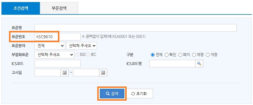 정전기 방전 내성시험 방법인 KS C 9610-4-2:2017를 찾기 위해 표준번호란에 공백없이 "KSC9610"를 입력하고 검색