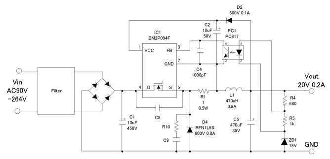 입력전압은 리플을 지닌 고전압으로, 내장 MOSFET에서 고속으로 ON / OFF하므로 입력부에 필터를 추가함으로써 노이즈를 저감시킬 수 있습니다.