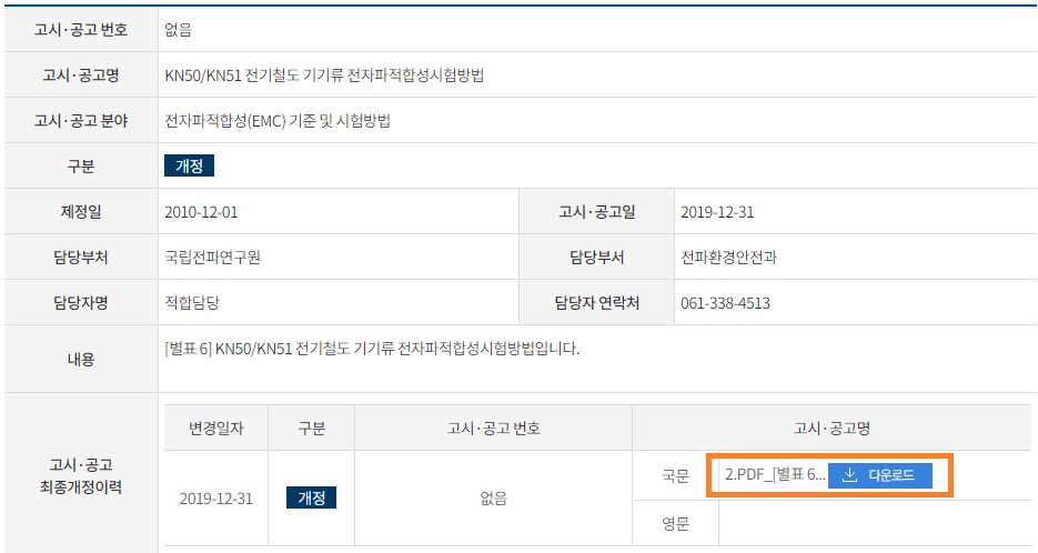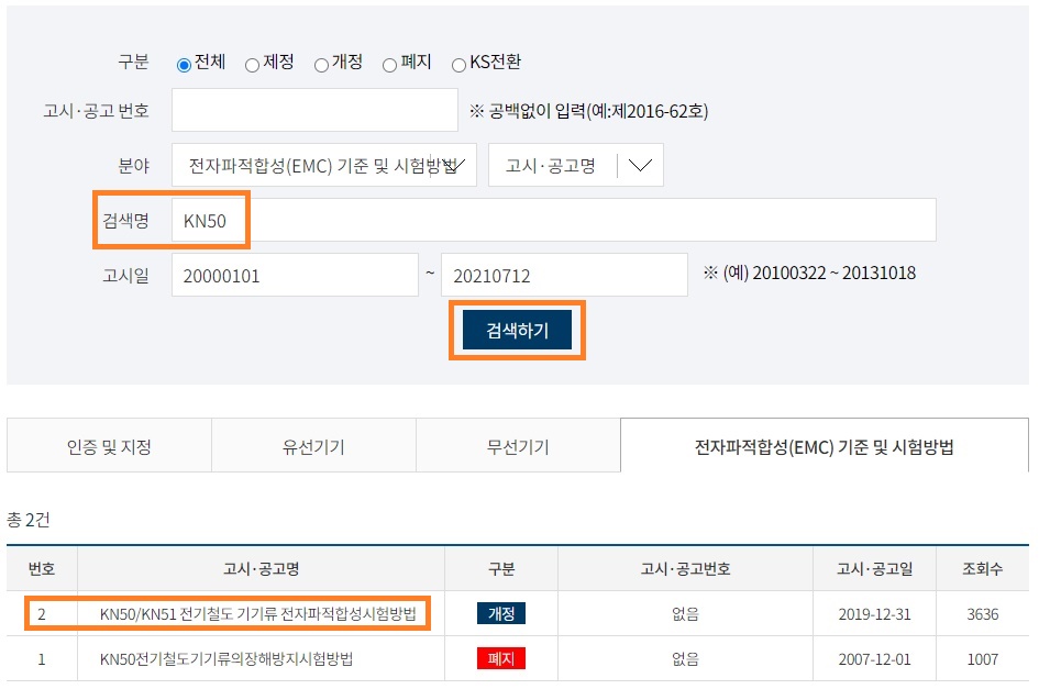 전기철도기기류의 전자파적합성 시험방법 KN 50/KN 51을 확인하기 위해 검색명에 "KN50" 입력후 검색