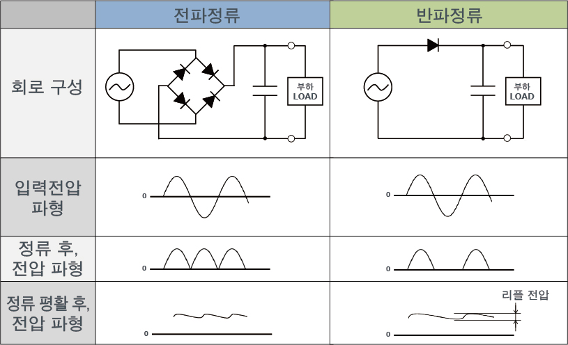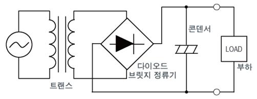 3) 평활화: 콘덴서(축전기)의 축 방전을 이용하여, 직류(맥류)의 파형을 평평하게 변환합니다.