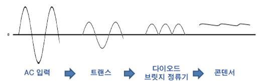 전압 강압 -> 전파 정류 -> 평활화