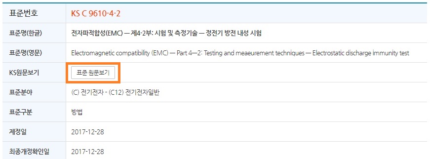 "KS C 9610-4-2:2017"의 내용에서 "표준 원문보기"를 클릭하면 시험방법에 관한 PDF파일을 볼 수 있다.