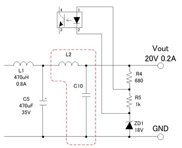 C9 : 500V / 1000pF, R10 : 10Ω / 1W 정도를 D4에 병렬로 추가합니다. 이는 ON / OFF 시에 발생하는 스파이크를 저감합니다. 입력 스너버와 동일한 개념이며, 정수는 참고치이므로 실제의 노이즈를 확인하여 조정해야 합니다.