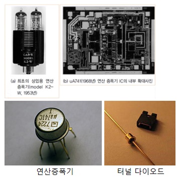 연산 증폭기 : 두 개의 입력단자와 한 개의 출력단자를 갖는다. 연산 증폭기는 두 입력단자 전압간의 차이를 증폭하는 증폭기이기에 입력단은 차동 증폭기로 되어있다. 연산 증폭기를 사용하여 사칙연산이 가능한 회로 구성이 가능하므로 연산 증폭기라 부르며, 미분기 및 적분기 구현도 가능하다. AC,DC 신호증폭기/ 임피던스 매칭용 버퍼/ 전류-전압 변환기 / 적분기/ 정밀 전류기/ 아날로그 필터/ 발진기