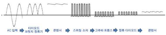 전파 정류 -> 평활화 -> 고주파 초퍼 제어 및 전압 강압 -> 반파 정류 -> 평활화