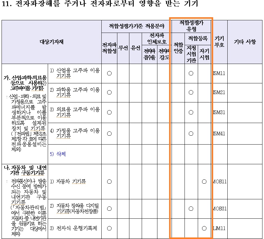 11. 전자파장해를 주거나 전자파로부터 영향을 받는 기기