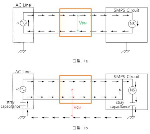 a. 차동 성분 노이즈(Differential Mode noise): 전원선 간에 실리는 노이즈로 진행 방향이 서로 반대