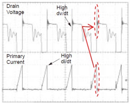 트랜지스터(스위칭 소자)를 on/off 하는 것(switching)은 고주파 노이즈를 유발한다. 트랜지스터가 off 되는 타이밍에, 높은 di/dt는 voltage spike(과도전류)와 ringing(울림)을 유발한다(그림 4). 트랜지스터의 drain과 source 사이의 전압(VDS)은 높은 dv/dt 특성을 갖고 있으므로, switching시에 발생되는 노이즈는 매우 큰 노이즈이다.