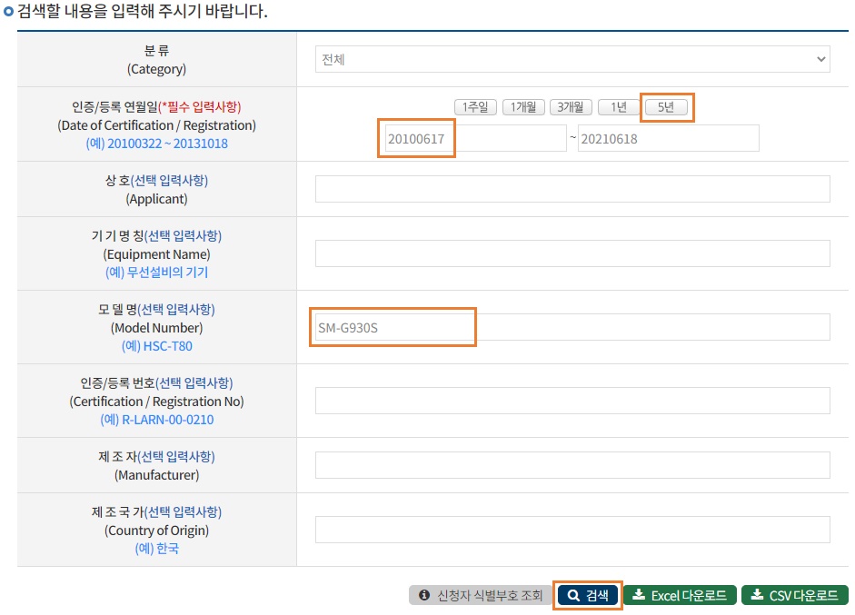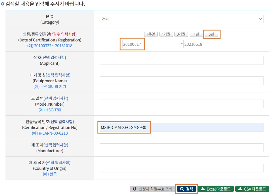 갤럭시 S7의 MSIP는 2014 ~2017년의 기간에 사용된 인증번호이다. 따라서 검색기간 설정에서 이 기간이 포함되도록 해주어야 한다.