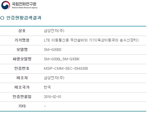 이렇게 인증번호가 검색되고 인증현황이 표시된다는 것은 SM-G930S 모델(파생모델 포함)이 전파법 법규에 규정된 전자파 적합성의 규격을 만족(인증/등록)한다고 확인되는 것이다.