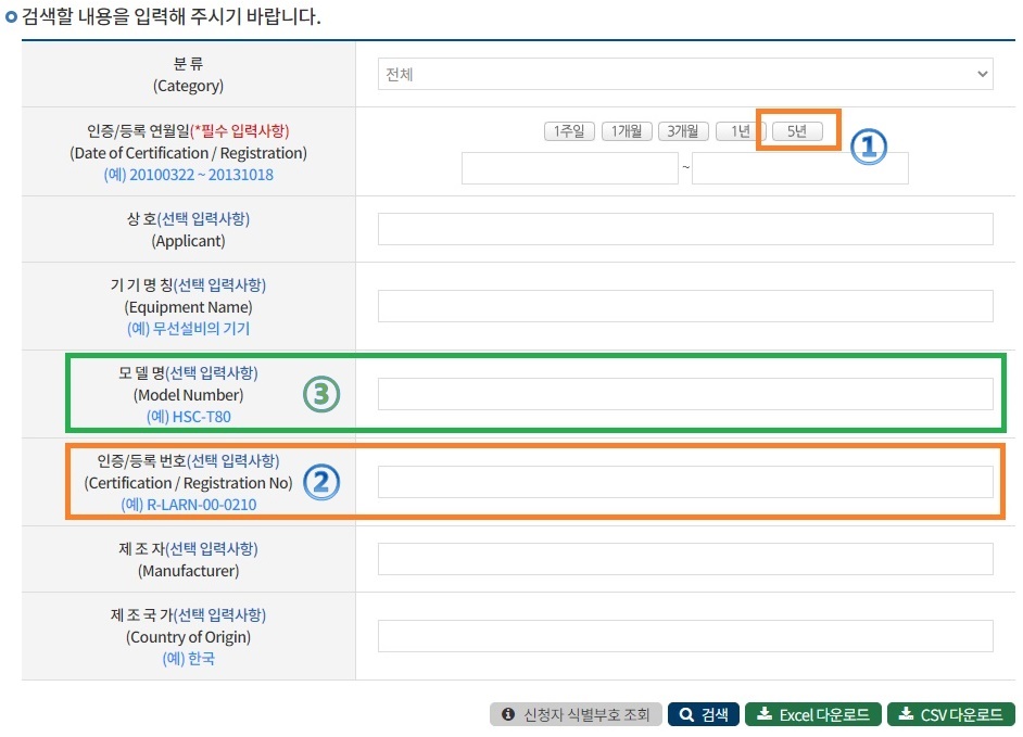 1. 적합성 평가 현황 검색창에서 ① 검색할 인증번호의 인증 발급일을 포함하는 기간을 설정해준다. 인증번호가 “R-R-” 형식이라면 5년을 선택하면 충분하고 기타 다른 형식이라면 5년을 클릭한 뒤 시작 연월일을 2010XXXX로 변경해주어야 검색기간에 포함되지 않아 검색이 되지 않는 경우를 방지할 수 있다.