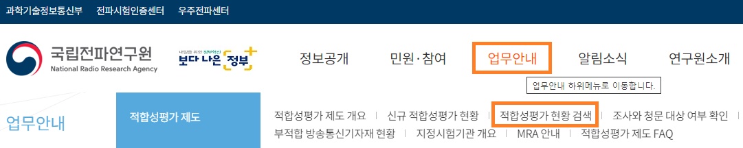 국립전파연구원 홈페이지 -> 업무안내 -> 적합성평가 현황 검색