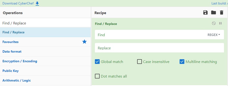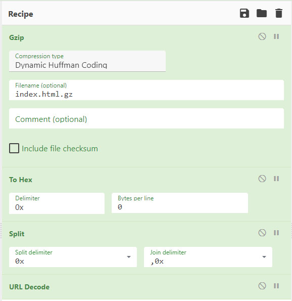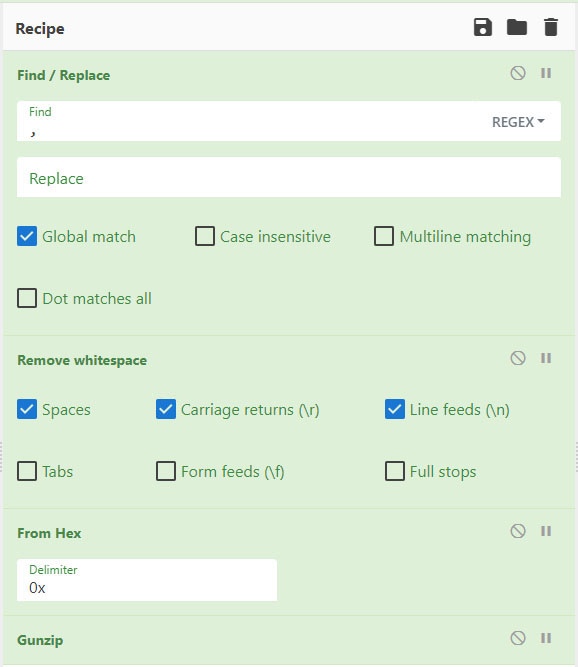추가로 Remove whitespace와 From Hex, Gunzip를 검색하여 드래그 한 뒤 아래 그림처럼 설정해 줍니다.