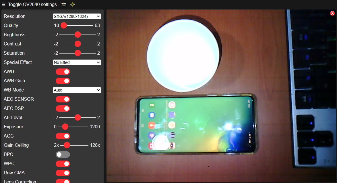 Toggle OV2640 settings 웹페이지는 예제 스케치의 camera_index.h 파일 안의 "index_ov2640_html_gz" 배열에 GZIP압축 데이터로 코딩되어 있습니다. 이 압축된 데이터는 웹브라우저에 내장된 압축해제 코드에 의해 풀리고 일반 HTML로 표시됩니다.