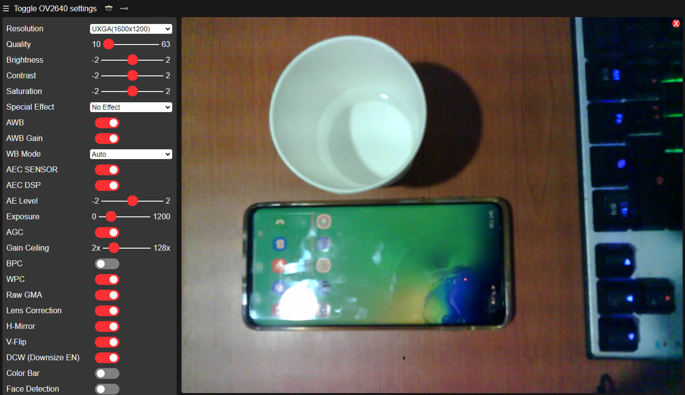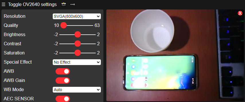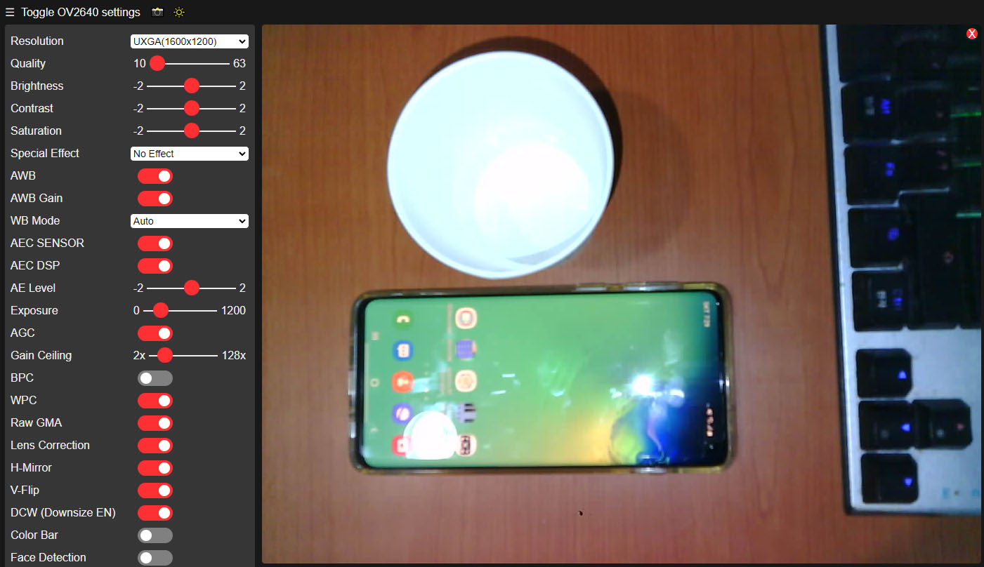 "☰ Toggle OV2640 settings"를 클릭하면 옵션 설정창을 펼치고 닫을 수 있습니다. 설정창에서는 해상도와 밝기, 명도, 채도등을 설정할 수 있으며 안면 인식 기능은 정상 작동하지 않았습니다. 화면 해상도 CIF(400x296) 이하에서 안면 인식 기능을 활성화시키면 "CORRUPT HEAP: Bad head at 0x3ffe25dc. Expected 0xabba1234 got 0x00000008" 메모리 오류와 함께 ESP32 CAM이 리부팅되는 오류가 발생하여 확인할 수 없었습니다.
