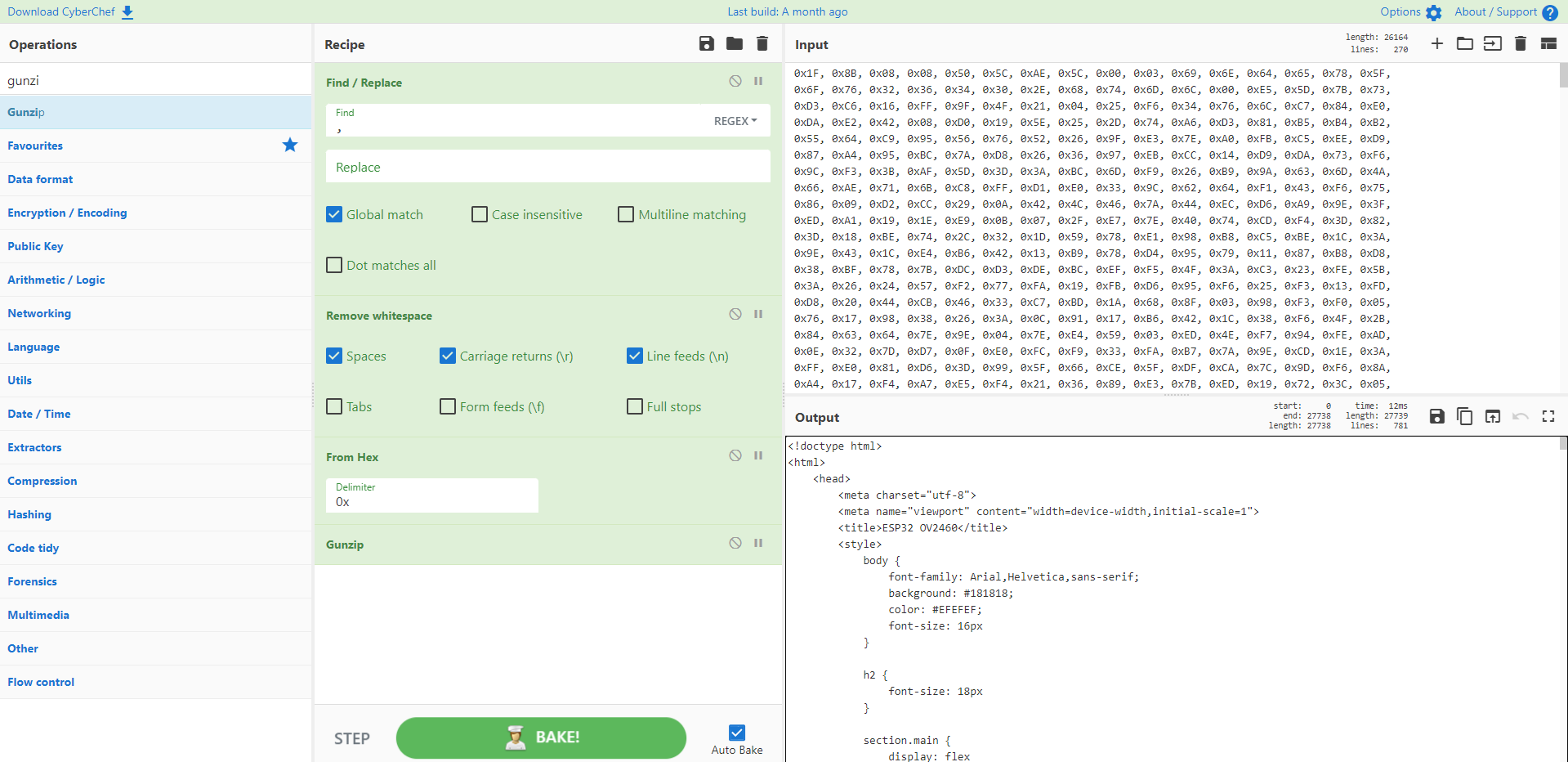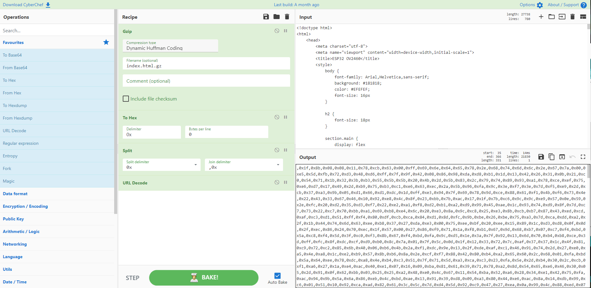 An easy way to edit or add HTML in the source of the ESP-WHO camera web server example Using the CyberChef online tool makes it easy to convert from your own HTML to the Gzipped Hex format found in the the index_html_gz variable in the code for Arduino and