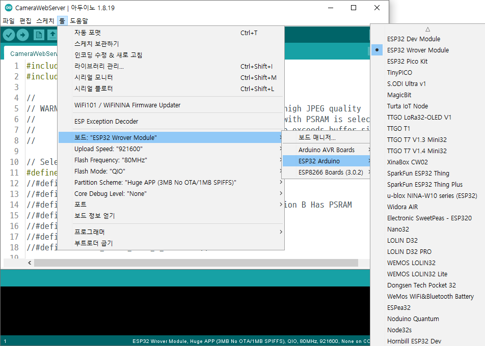 아두이노 IDE에서 툴 => 보드 => ESP32 Arduino => ESP32 Wrover Module을 선택합니다.