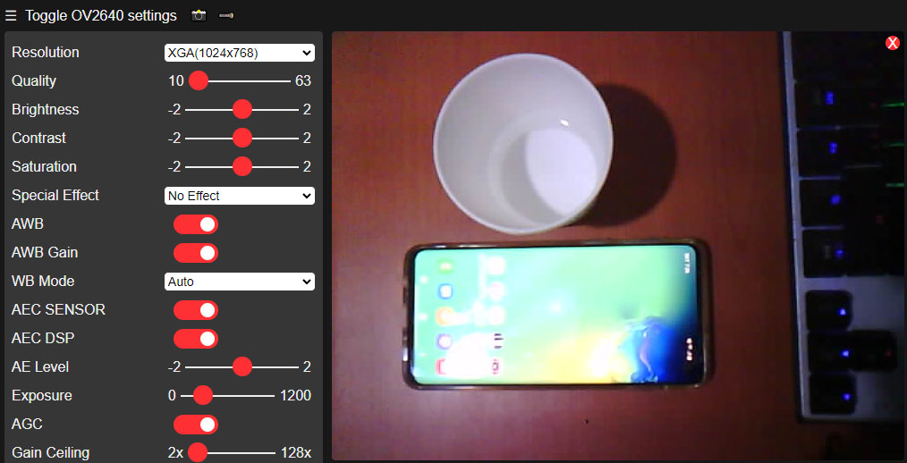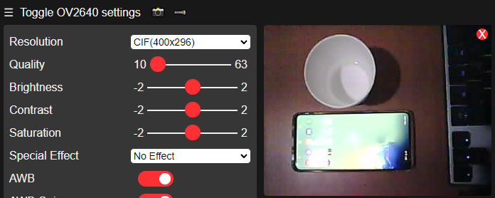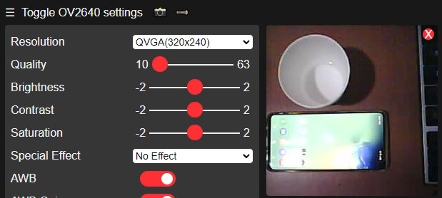 휴대폰의 웹브라우저에서 AP주소 192.168.4.1을 입력해 주면 Toggle OV2640 settings 페이지에 들어갈 수 있습니다.