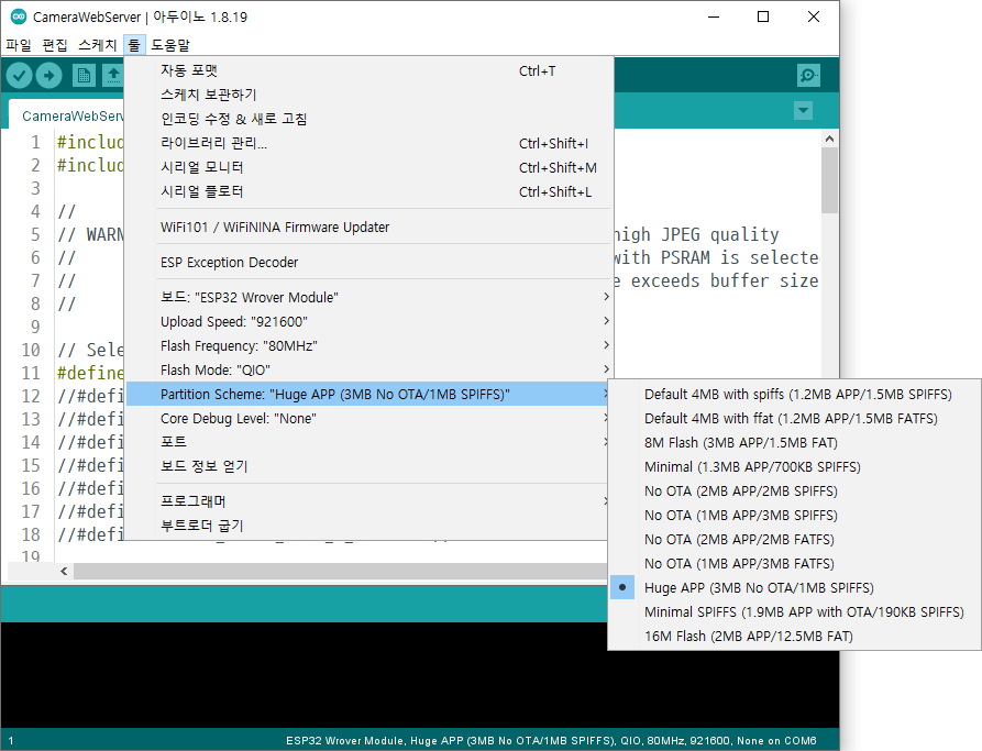 다음으로 툴 => 보드 => Partiion Scheme => Huge APP (3MB No OTA/1MB SPIFFS) 선택하고 ESP32 CAM이 연결된 포트를 선택한 뒤 스케치를 업로드합니다.