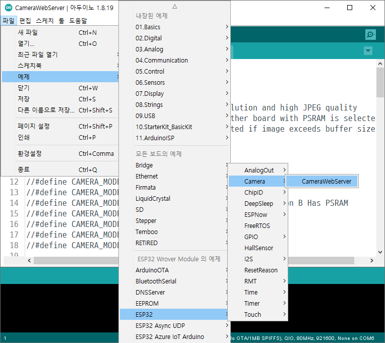 아두이노 IDE에서 파일 => 예제 => ESP32 => Camera => CameraWebServer를 선택합니다.