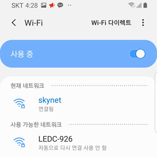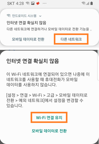 이때 안드로이드 버전에 따라 다르게 출력되는 "인터넷 연결 확실치 않음" 메시지에 대한 응답으로 "다른 네트워크"를 클릭하거나 "인터넷 연결 유지" 또는 "한 번만 연결" 또는 "항상 연결"중 하나를 선택합니다.