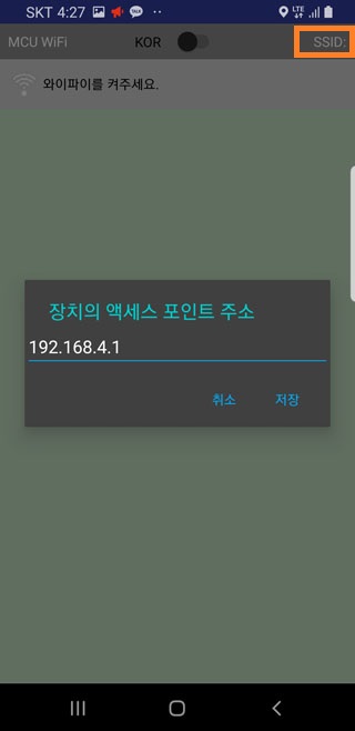 2. "SSID:"를 클릭하면 앱에 설정된 액세스 포인트 주소를 확인하고 아두이노에 설정된 액세스 포인트 주소값이 상이한 경우 해당 주소로 변경할 수 있습니다.