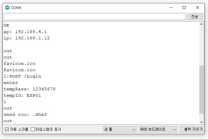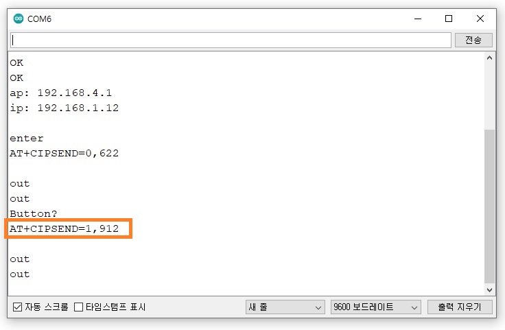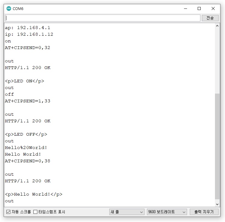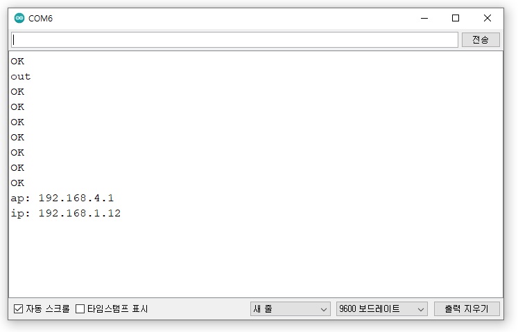 상기의 AT command를 앞서 보드 레이트 변경 시와 같이 주석 앞부분을 복사하여 차례대로 아두이노 시리얼 모니터 입력창에 붙여 넣기 한 뒤 엔터를 치면 아래와 같이 ESP-01 모듈이 설정되는 것을 볼 수 있다.
