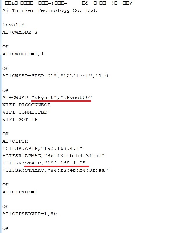 AT+CWSAP="esp01","1234test",5,3 // AT+CWSAP= softAP SSID, Password, channel id, ecn