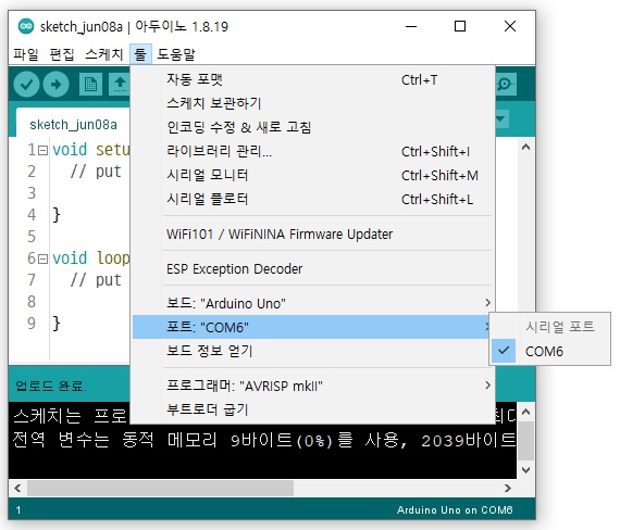 확인이 되었으면 스케치 상 보드 레이트를 9600 상태에서 저장을 시켜놓자. 이제 보드 레이트 115200은 사용하지 않게 된다.