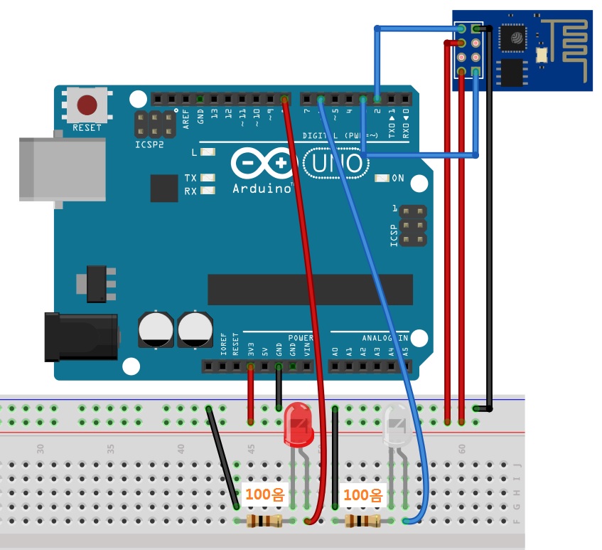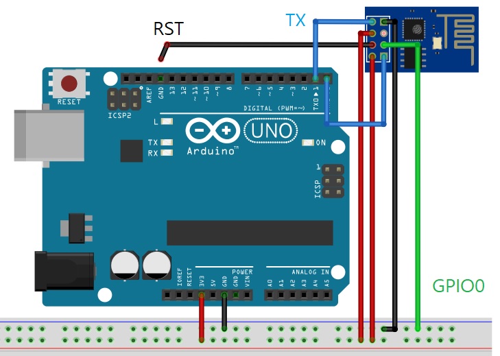 아두이노의 출력 핀 TTL 전압은 5V이고 ESP-01 모듈은 3.3V이다. 따라서 아두이노 TX핀에서 출력되는 신호 전압을 TTL 레벨 쉬프트를 통해 ESP-01 모듈의 RX 핀에 3.3V의 신호 전압으로 변경해주어야 하지만, 테스트상에서는 별 문제가 없어서 아래와 같이 TTL 레벨 쉬프트 없이 연결하였다. 이 연결 방식은 장시간 사용 시 ESP-01 모듈에 손상을 줄 가능성이 있다.