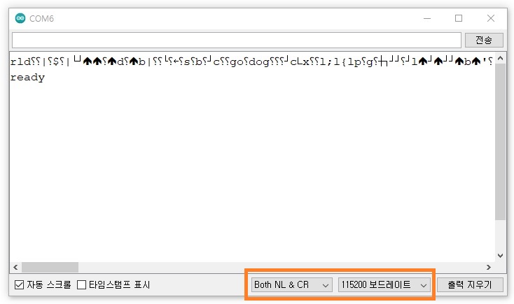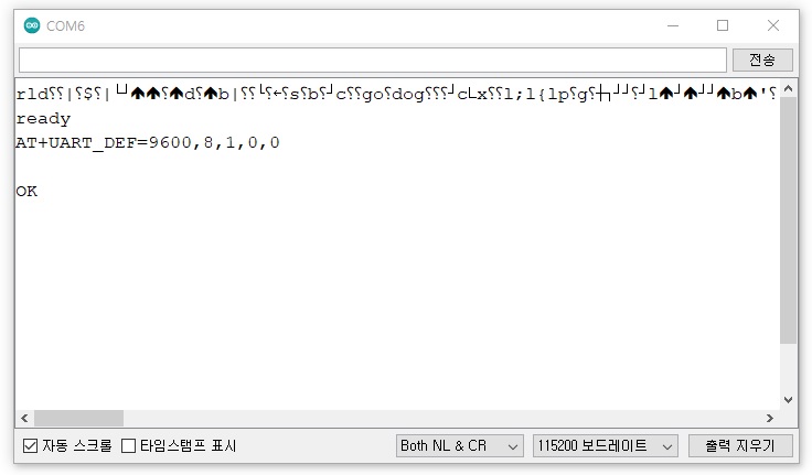 아두이노 시리얼 모니터의 전송 옵션을 Both NL & CR, 보드 레이트를 115200으로 맞추어 주고 아두이노 시리얼 모니터 입력창에 AT를 입력하고 엔터를 친다.