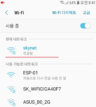 스마트폰에서 wifi 장치를 켜게 되면 상기에서 설정한 대로 SSID "esp01"이 검색될 것이다. 클릭하고 설정해 놓은 비밀번호를 입력하고 연결해 보자. 연결 후 네트워크 설정 관리에 들어가 보면 스마트폰이 할당받은 ip 주소를 확인할 수 있다. 아두이노 원격제어에서 우리가 할당받은 ip주소를 사용할 일은 거의 없다. 단지, soft AP의 주소와 비슷하여 혼동을 방지하기 위해 확인이 필요한 것뿐이다.