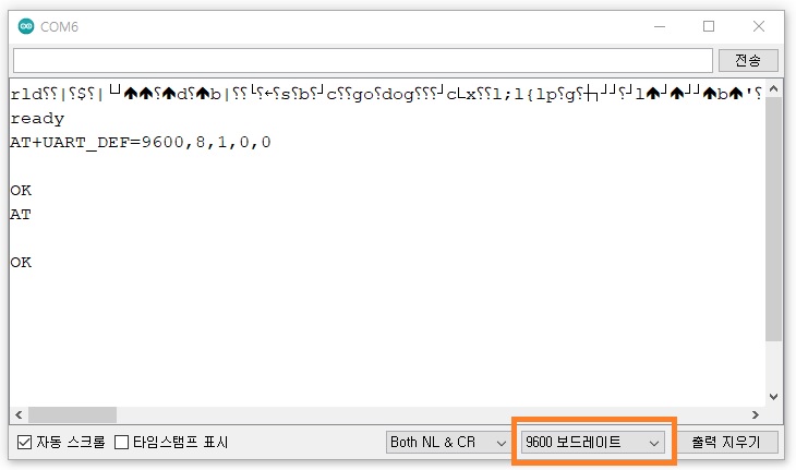 아래처럼 OK 응답이 표시된다면 ESP-01의 baud rate가 9600으로 변경된 것이다.