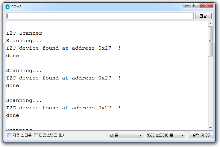 LCD 출력이 되지 않는다면 아래 I2C scanner 스케치를 아두이노에 업로드해주고 시리얼 모니터에 출력되는 주소 값을 확인해 보자. 아래 그림처럼 address 값을 찾아 시리얼 모니터에 출력해준다.