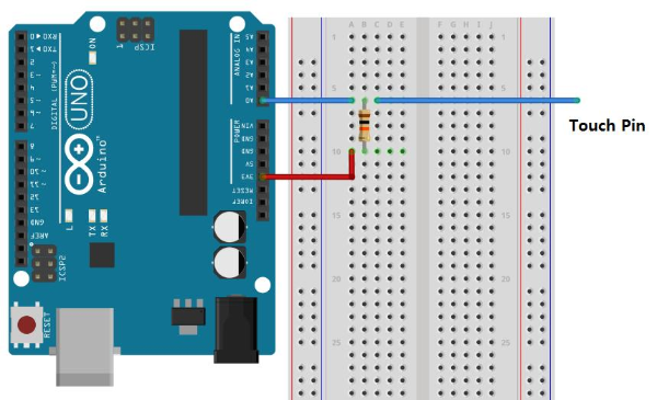 터치센서를 구현하는 방법은 가변저항을 아날로그 입력 핀에 연결하여 전압을 측정하는 것과 비슷한 원리이다. 단지 차이점은 고정된 저항(10K 옴)을 기준으로 전압을 측정하고 이를 기준 전압으로 정하고 사람이 터치 핀을 만졌을 경우 발생하는 전압의 변동을 인지하여 작동하는 방식이다.