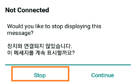 블루투스가 연결이 되지 않은 상태에서 블루투스로 데이터를 전송하려고 시도하면 표시되는 메시지이다. 블루투스 연결 전에 앱을 설정할 것이므로 "Stop"을 클릭하여 더 이상 메시지가 표시되지 않도록 해준다.