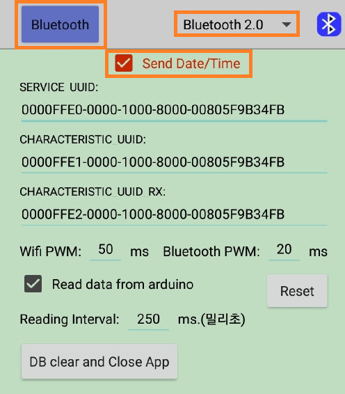 블루투스가 연결되면 최초 1회 날짜 및 시간 정보를 전송하는 기능을 사용하기 위해 Send Date/Time 체크박스에 체크를 해준다. 아두이노의 블루투스 모듈이 HC-06이라면 Bluetooth 2.0을 선택한 상태에서 Bluetooth 버튼을 클릭하여 연결해주고 AT-09와 같은 블루투스 4.0 BLE 모듈이라면 Bluetooth 4.0으로 변경해준 상태에서 Bluetooth 버튼을 클릭하고 연결을 해준다. 연결이 되면 블루투스를 이용하여 무드등을 원격 제어할 수 있다.