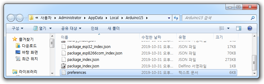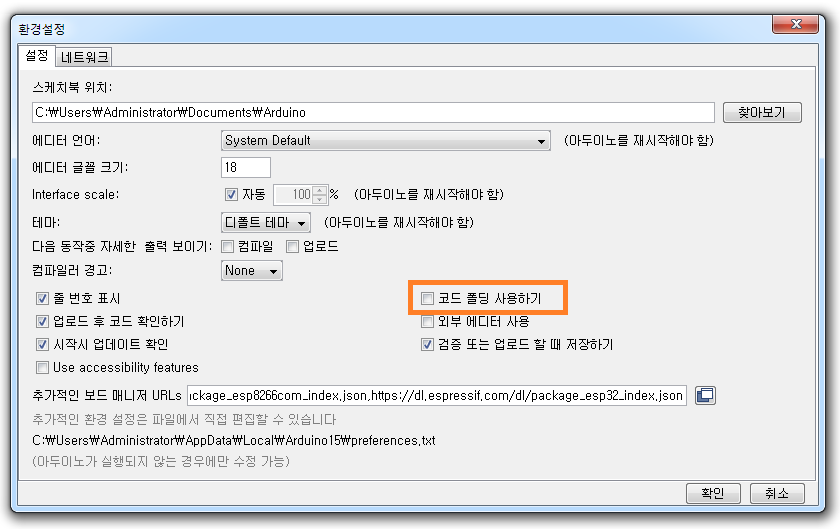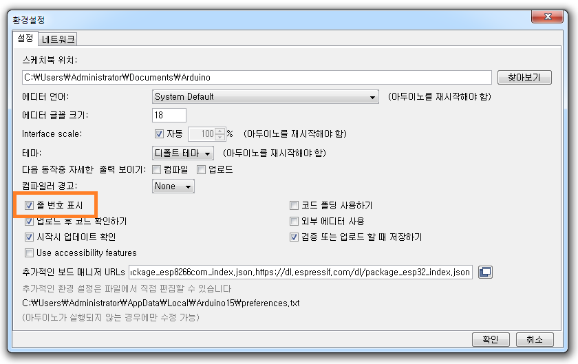 아두이노 IDE가 종료되었다면 preferences.txt 파일에서 아래 항목을 찾아 수정해준다.