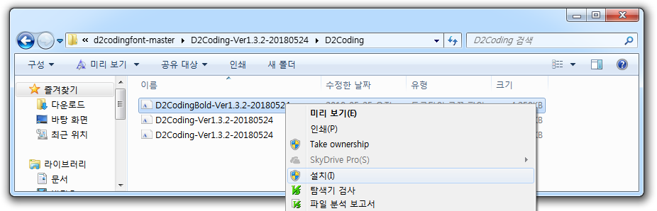 D2Coding 폴더 안에 있는 파일 3개 모두를 마우스 오른쪽 버튼 클릭 시 나오는 메뉴창에서 "설치"를 클릭하여 설치해준다.
