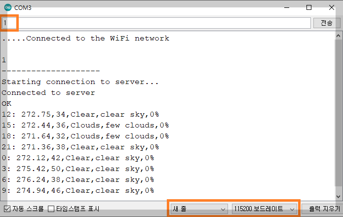 오픈웨더맵에서 3시간 단위로 24시간 기상예보를 받는 코드입니다. 시리얼 모니터에 1을 입력하시면 연결 및 수신을 시작합니다.