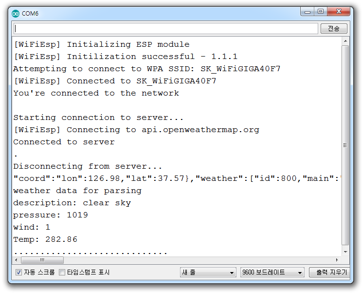 이전 글의 아두이노 오픈 웨더 맵 API 날씨정보 수신 스케치에서 상기 코드를 이용하여 데이터를 추출해 보자.