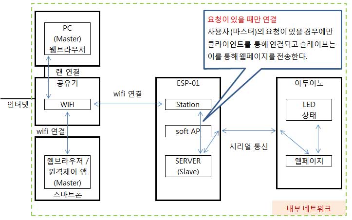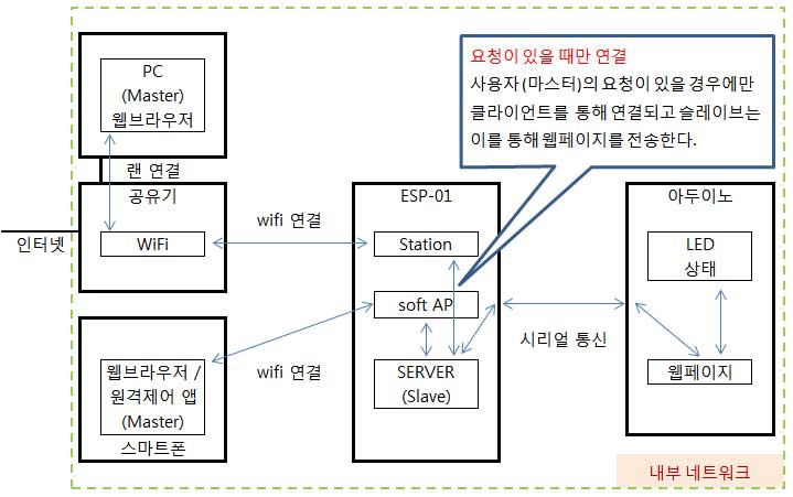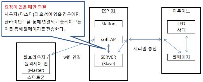 스마트폰에서 ESP01의 webserver에 접속하는 방법에는 스마트폰이 연결된 공유기를 통해 내부 네트워크 상의 ESP01의 webserver에 접속하는 방법과 스마트폰을 ESP01의 soft AP에 직접 연결하여 webserver에 접속하는 두 가지 방법 중 하나를 사용할 수 있다. 이는 ESP01이 공유기와 연결하기 위한 station 모드와 스마트폰과 같은 단말기의 연결을 허용하기 위한 soft AP(액세스 포인트) 모드를 지원함으로써 가능하며, 두 모드 중 각각의 모드를 선택하여 활성화하거나 또는 동시에 두 모드를 활성화하여 공유기에 연결한 상태에서 스마트폰과의 연결도 할 수 있다. 하지만 ESP01 모듈이 시리얼 통신을 통해 아두이노와 연결되어 있다는 점과 모듈 자체의 하드웨어적인 한계 또는 와이파이 라이브러리의 문제로 인하여 아두이노가 데이터를 수신할 때에는 큰 불편함이 없으나 아두이노에서 데이터 송신 시 그 시작과 종료에 약 5초 정도의 시간이 소요되어 실제 사용상에는 무리가 있을 수 있다. 실제 데이터 전송에는 약 1 ~ 2초 정도 소요되나 클라이언트를 종료시키는 과정에서 3초 정도의 딜레이가 발생하였다(라이브러리 문제일 가능성이 있다).