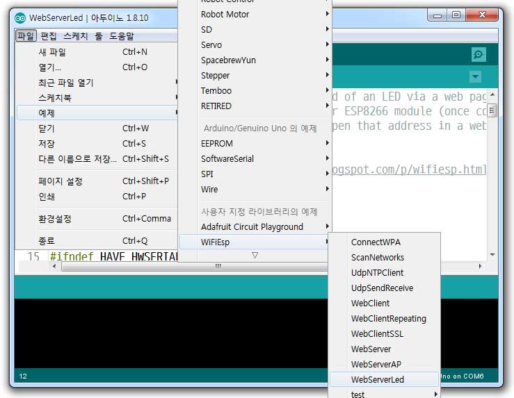 아래 그림처럼 아두이노 IDE의 파일 -> 예제 -> WiFiEsp -> WebServerLed 예제를 실행시킨다.
