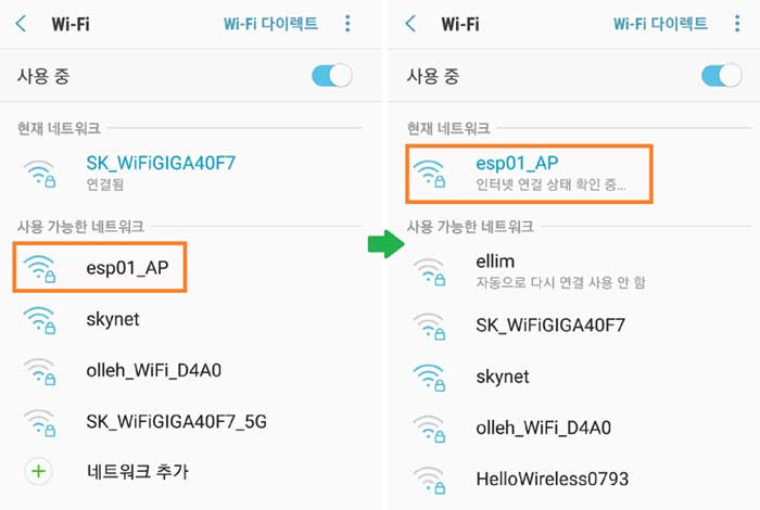 상기 코드를 아두이노에 업로드해주고 아래 그림처럼 스마트폰의 와이파이 연결 프로그램에서 "esp01_AP"에 연결을 한다.