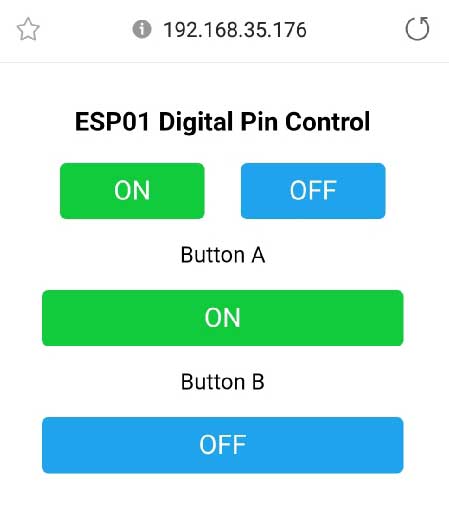 이 웹페이지(회신 데이터)는 시리얼 통신을 통해 ESP01로 전송되고 다시 와이파이를 통해 스마트폰의 웹브라우저에 디지털 핀의 현재 상태가 반영된 웹페이지를 표시하게 되어 아두이노의 디지털 핀을 제어할 수 있게 된다.