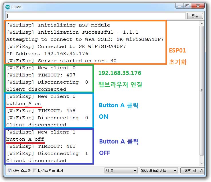 ESP01의 시리얼 통신 보드 레이트가 9600으로 설정되어 있어야 한다. ESP01의 연결 설정 및 자세한 방법에 관해서는 이전 글 아두이노 - ESP01 wifi 모듈 무선 원격제어 그리고 시리얼 통신 - 6편을 참조하기 바란다.