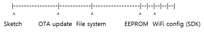 Sketch 영역은 스케치가 업로드되는 영역이고 OTA update는 무선으로 스케치를 변경하기 위해 할당된 영역이며 File system이 다루고자 하는 SPIFFS 라이브러리에 의해 생성된 파일들이 저장되는 영역이다. WiFi config 영역은 WiFi 환경에 관한 내용들 SSID, Password등 WiFi 연결에 관한 설정을 저장하는 항목인데 보안상 이유 때문에 일반적으로 직접 접근하여 수정할수 없고 Wifi 라이브러리에 의해 관리되는 영역이다. 이러한 이유로 와이파이 관련 데이터가 변경될 경우 이전 데이터가 남아 있어 WiFi 연결이 지연되거나 오류(Stack Error)를 유발하는 경우가 있었다. SSID와 Password를 변경한 스케치를 반복적으로 업로드 하던중 간혹 발생했었다. 이런 오류가 발생하면 ESP8266의 전체 시스템을 공장 초기화 하고 스케치를 다시 업로드 하는게 쉬운 해결 방법이다. 공장 초기화 방법은 이전글 Esp8266 NodeMcu 및 ESP32 Dev Module, stack 오류 을 참조하기 바란다.