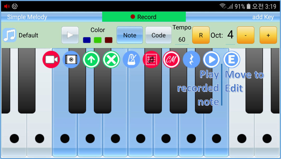 노트 녹화 버튼을 클릭하여 관련 버튼이 활성화 된 상태에서 피아노 건반을 터치하면 건반의 현재 음이름, 옥타브, 터치된 길이에 맞게 박자 값이 저장됩니다. 조표를 변경하고 건반을 터치할 경우 조표값이 반영됩니다. 쉼표는 쉼표 표시 버튼을 클릭하여야 입력됩니다. 입력하는 중간에 플레이 버튼을 클릭하여 입력된 멜로디를 확인할 수 있습니다. 입력이 완료되면 "E" 번튼을 터치하여 Edit 화면으로 이동한 후 수정하고 저장할 수 있습니다.