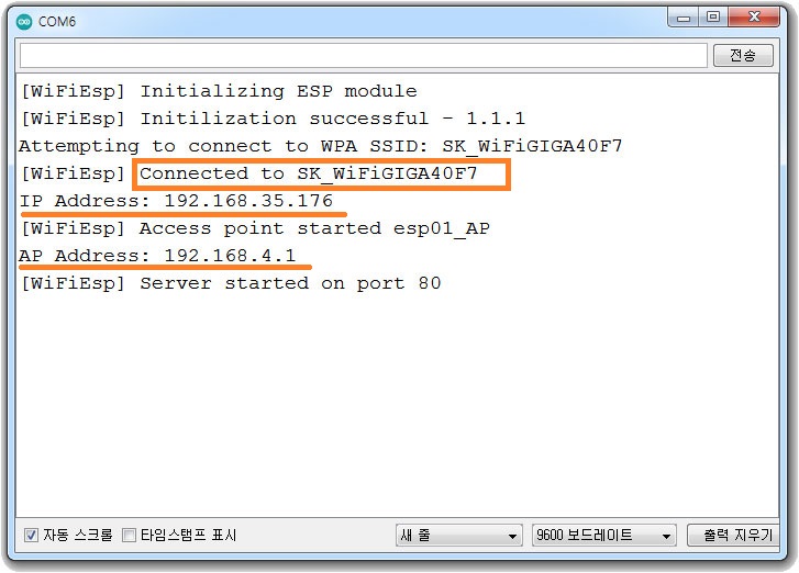 아두이노에 코드를 업로드하면 아두이노는 공유기에 연결을 하게 되고 또한 동시에 와이파이 액세스 포이트(AP)도 활성화하여 스마트폰이 연결할 수 있도록 대기하게 되고 아래 그림처럼 아두이노 시리얼 모니터에 공유기에서 할당받은 IP 주소와 외부장치 연결용 AP주소를 표시해 줍니다.